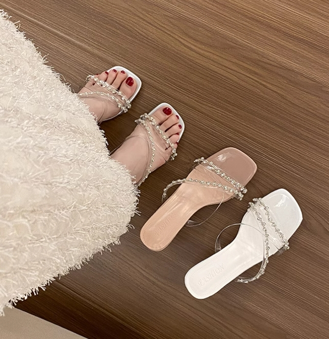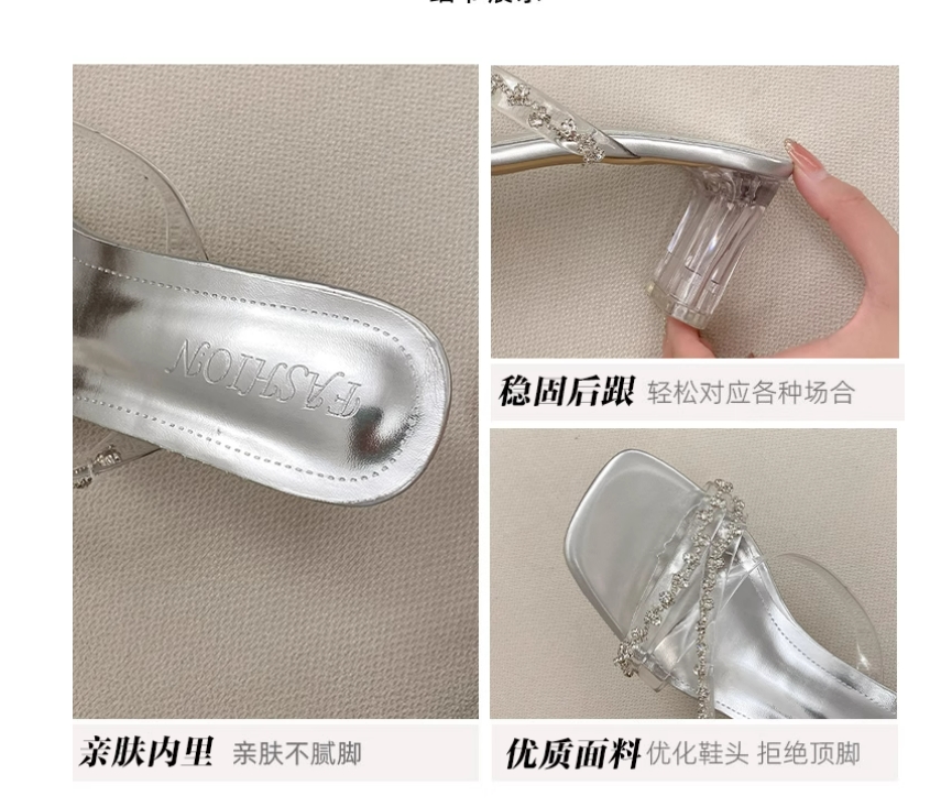 银色水钻水晶高跟一字拖鞋女夏季外穿